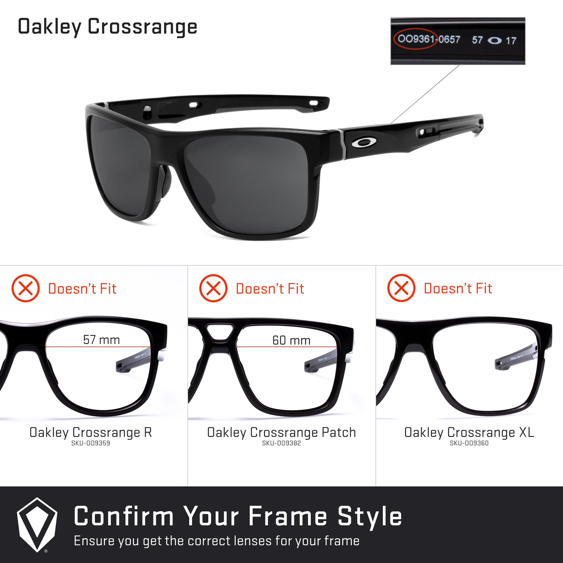 Make your old Crossrange OO9361 like new with our replacement lenses for Oakley sunglasses. These lenses perfectly fit Oakley Crossrange sunglasses with the model number OO9361 found on the inner side of the temple arm. And because our lenses meet or exceed the quality of your original Crossrange lenses, you'll get the same performance you've come to expect.